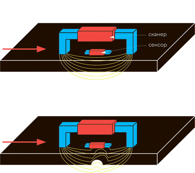 Иными словами – сигнал дефекта возникает в зонах изменений сопротивляемости (инерции) контролируемого металла циклическому перемагничиванию вследствие уменьшения «магнитной массы» в месте точечной язвы или утонения стенки. Комплекс производит как бы «магнитное качание» металла, вычисляет массу «магнитного маятника» под чувствительным элементом канала преобразователя, представляя ее в виде изменения амплитуды и фазы сигнала этого канала. Комплекс покажет и увеличение «магнитной массы», которое означает утолщение стенки или проход опорной конструкции трубы при внутритрубном контроле. Низкочастотным электромагнитным методом (5 – 30 Гц) используется только для ферромагнитных объектов.