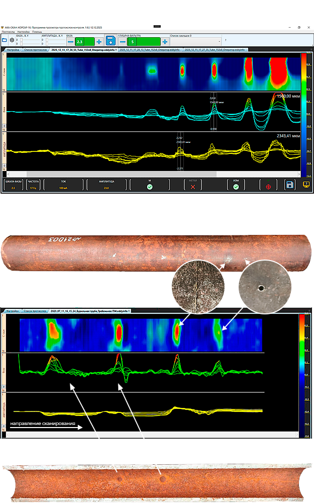 Справочно: обнаружение дефекта в виде отверстия диаметром 1.6 мм является обязательным требованием при приемке оборудования электромагнитного контроля согласно стандарту DS-1 Инспекция бурильных колонн (Том 3).