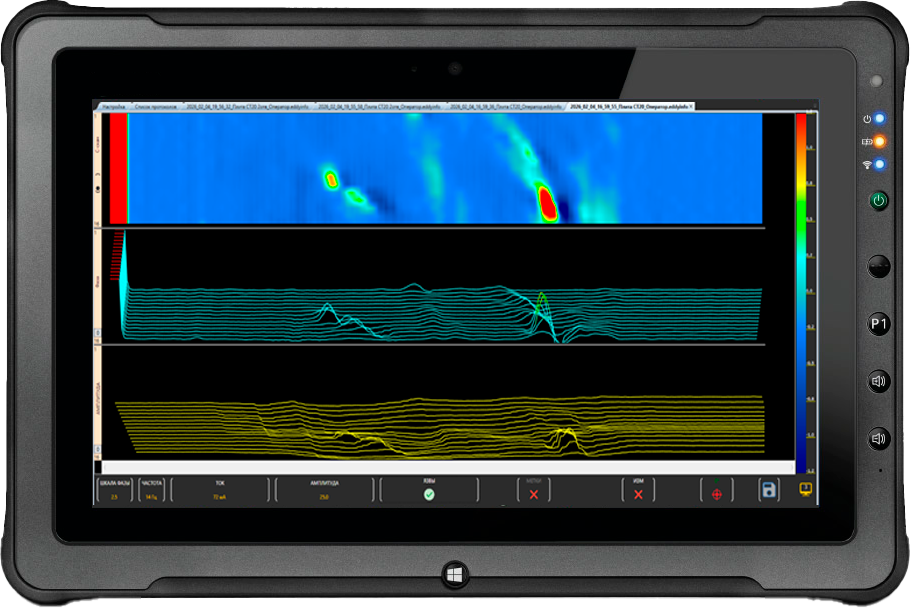 Рабочая информация на экране ноутбука или планшета представляется в виде A-Scan амплитуды, A-Scan фазы и C-Scan.
