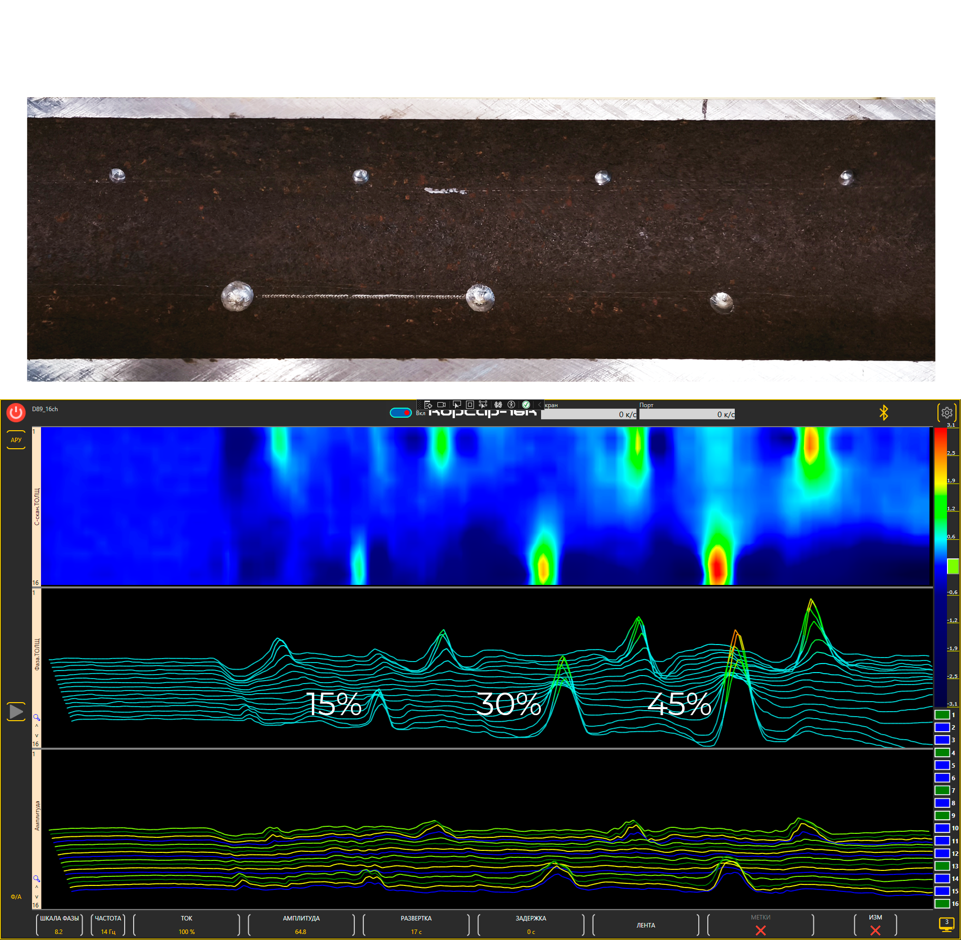 Принимаемые данные записываются в файл, после чего, используя экранные курсоры можно получить оценочные количественные данные о размерах язв и утонений. Для получения количественных данных с повышенной точностью нужно проводить калибровку на контрольном образце.